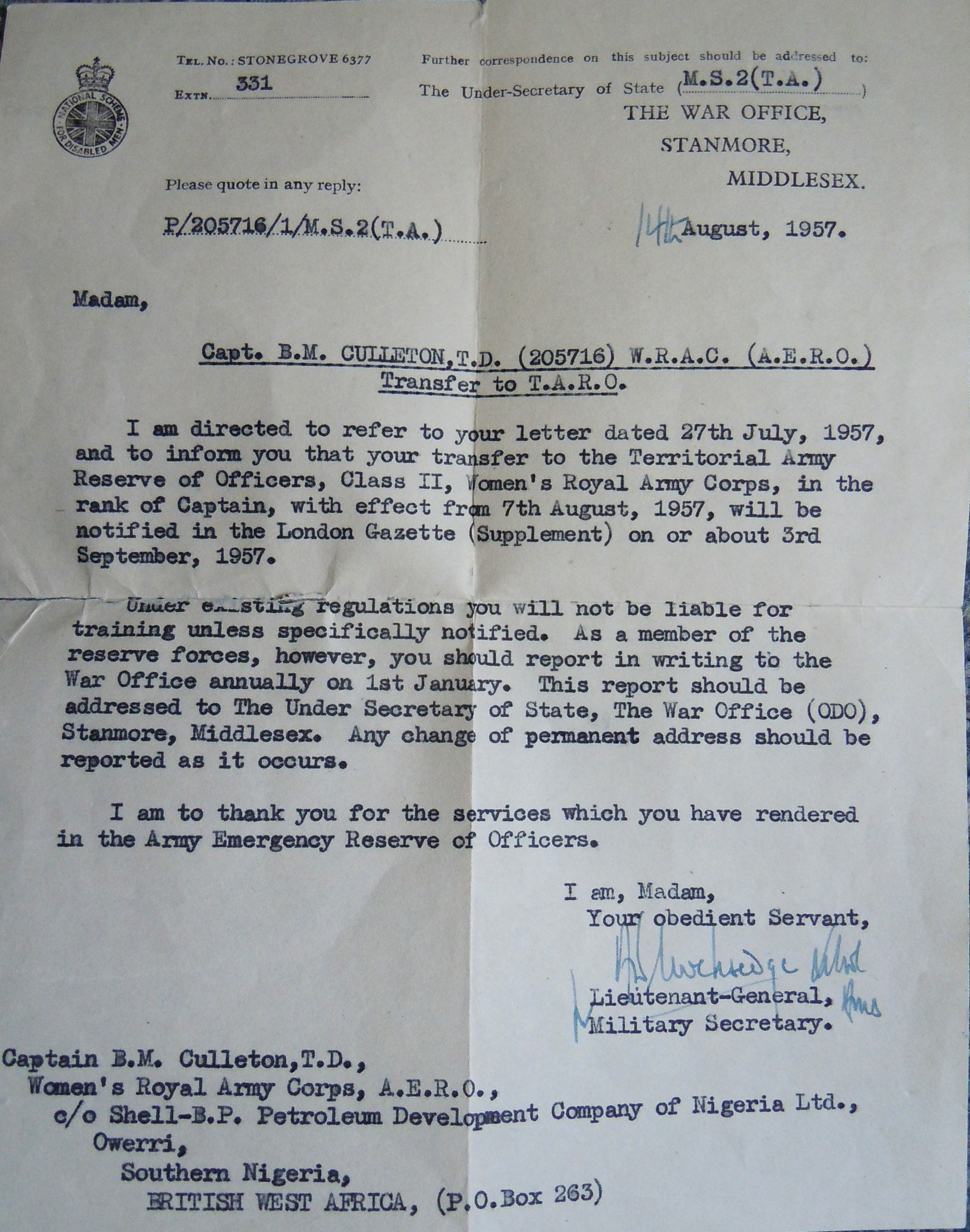 The on 1st January 1946, the war over and she was released from regular service. In September of the following year she was back in the Territorial Army with 916 (mixed) Transport Company Royal Army Service Corps, Territorial Army as a subaltern.