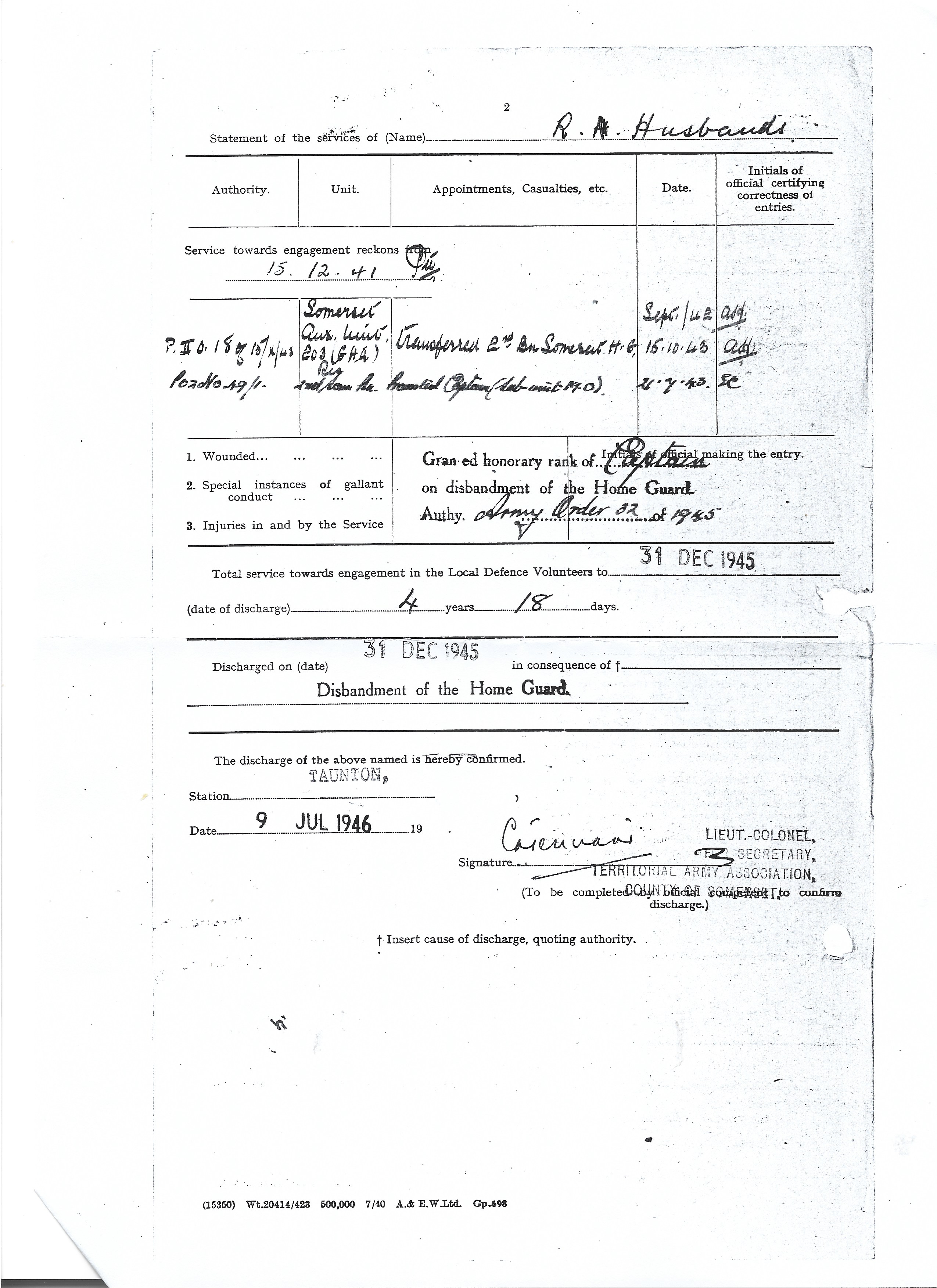 He was transferred to 2nd Somerset Battalion Home Guard 15th October 1943.