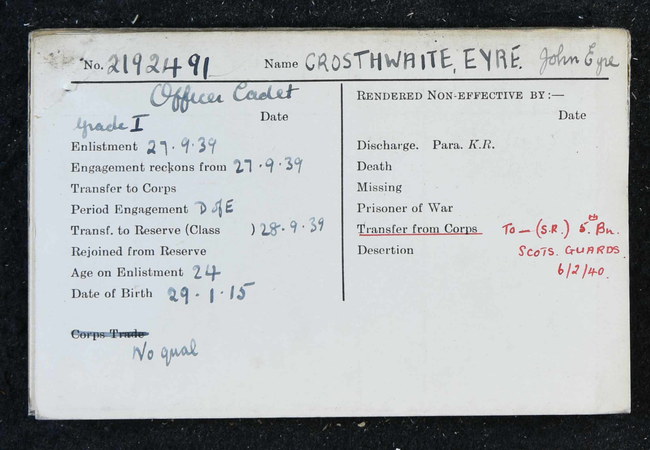 27 Sep 1939 Enlisted Royal Engineers as Officer Cadet 2192491