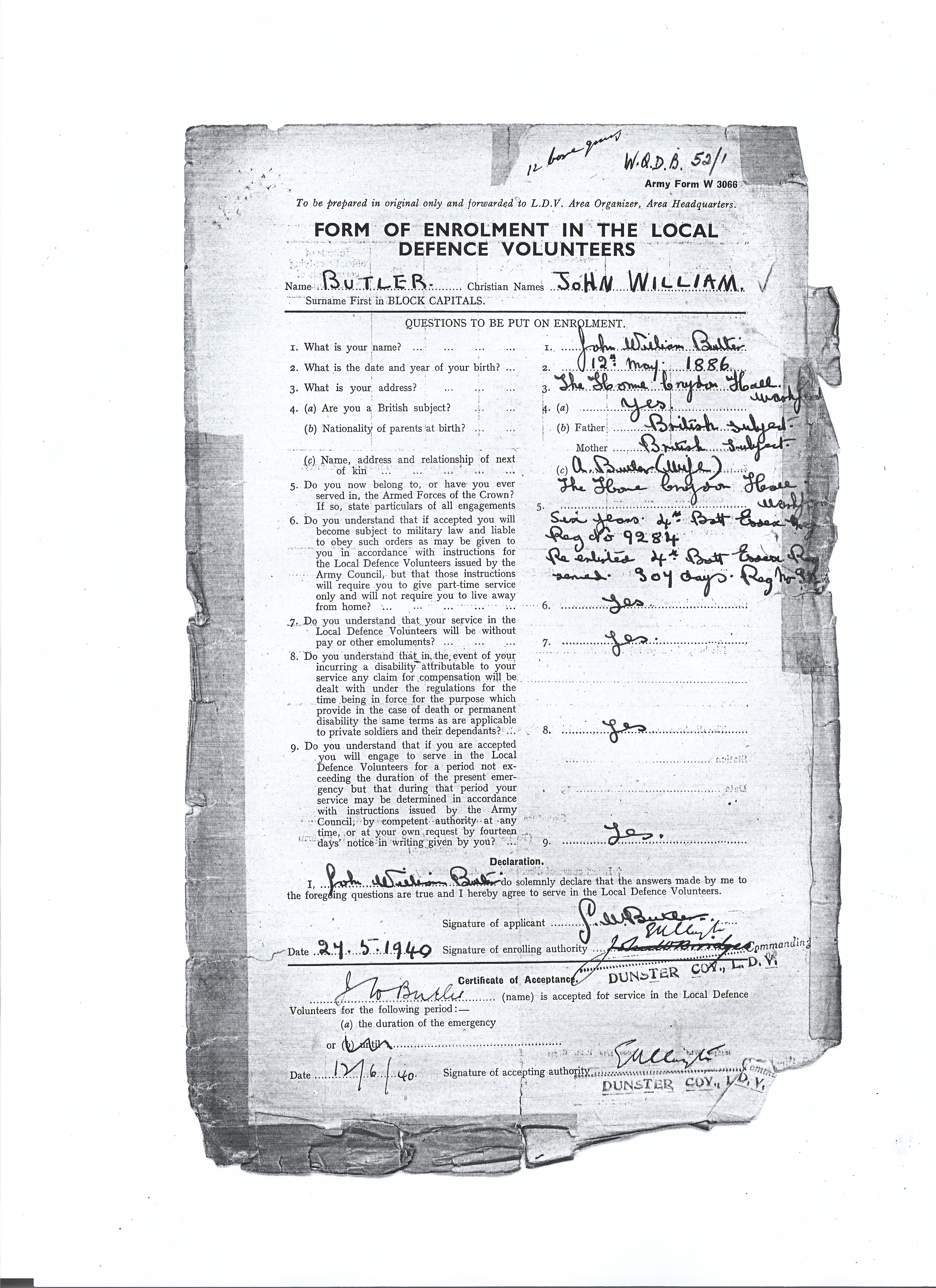 27 May 1940 Enrolled Local Defence Volunteers, accepted 12 June 1940 Dunster Company.