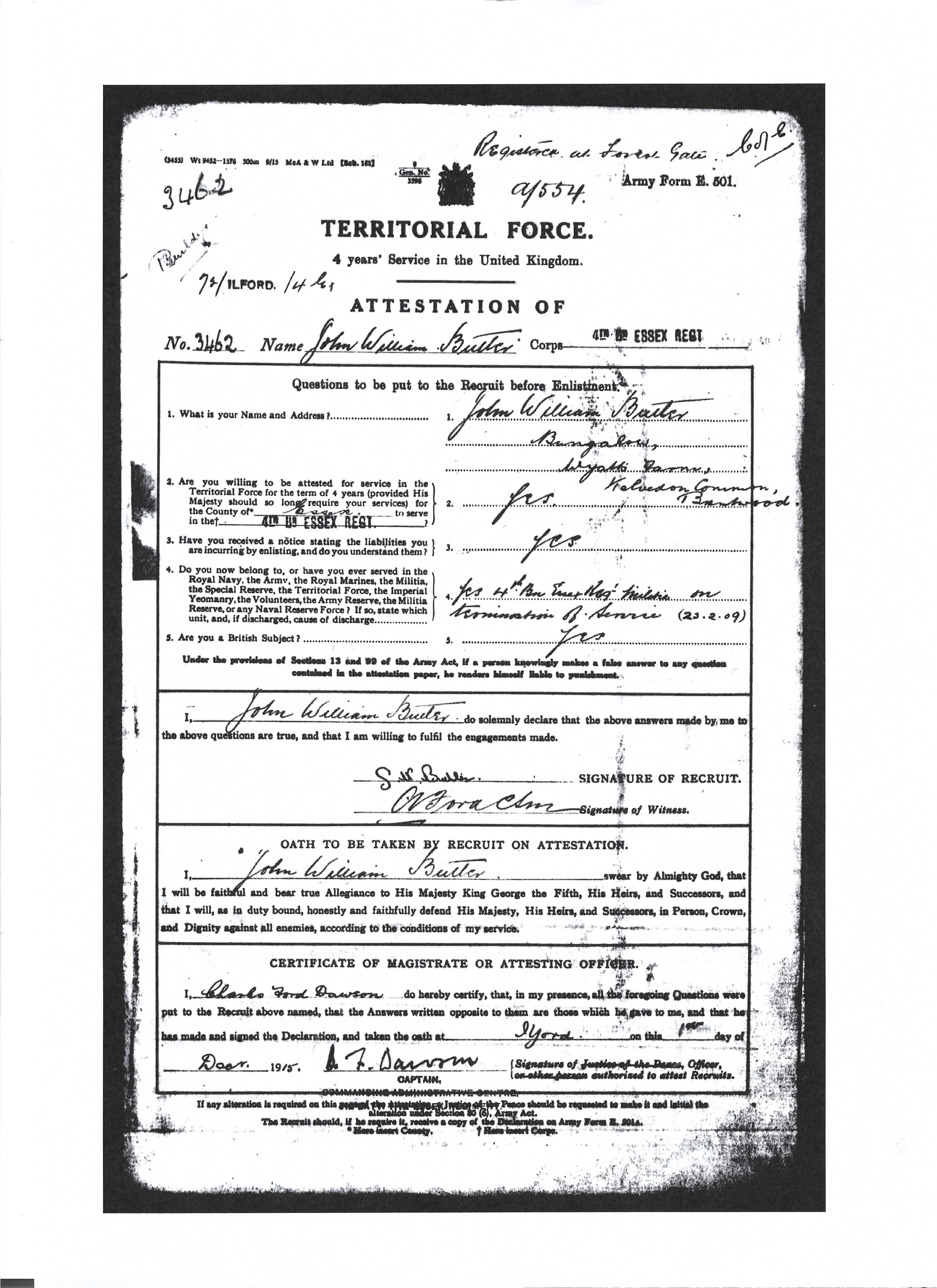 Reenlisted 4th Battalion Essex Regiment, Number 3462. Served for 307 days – 1 Dec 1915 to 2 Oct 1916. He did not serve overseas.
