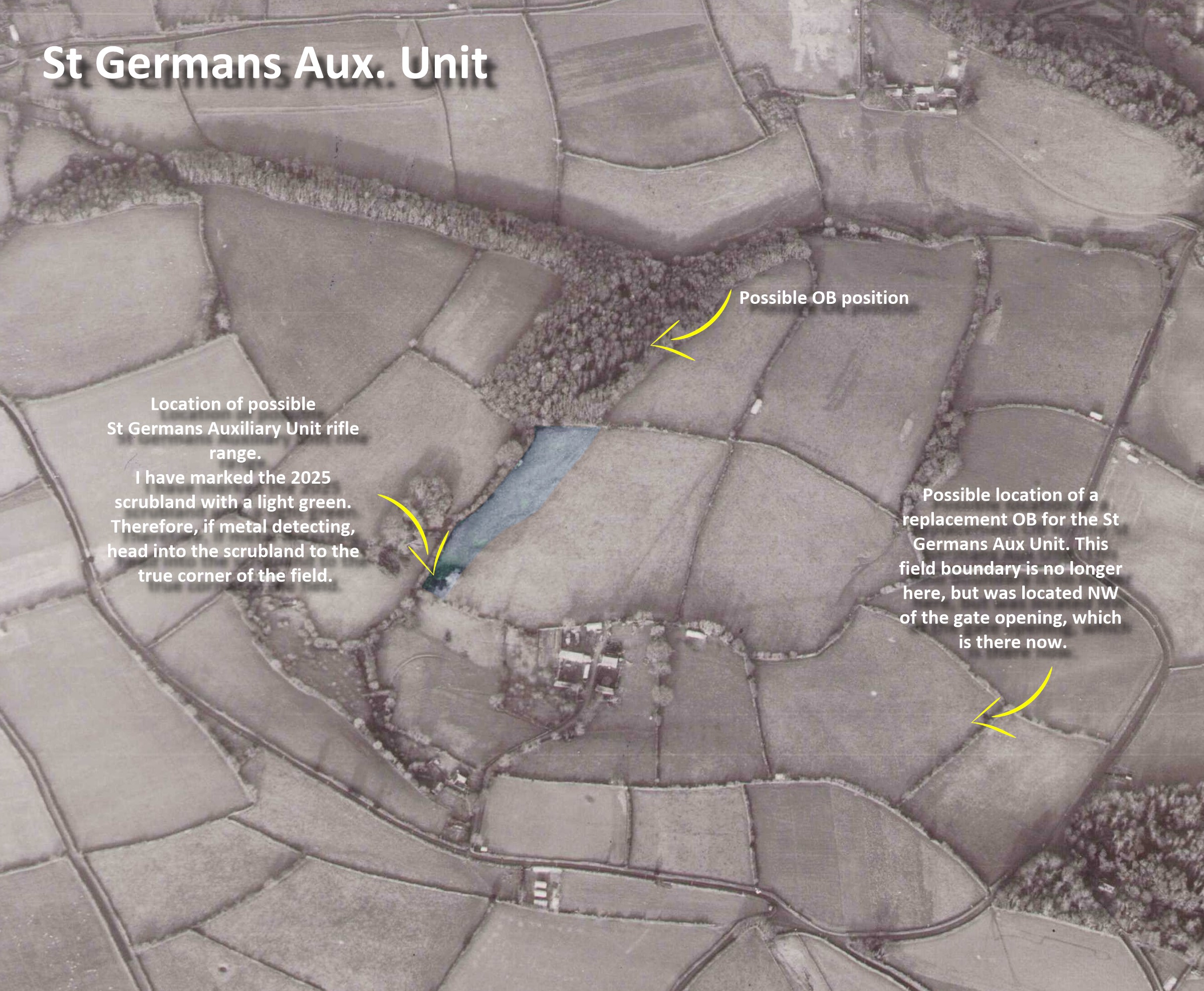 It is thought there were two OBs built on Auxilier Stephen's Farm at Lanjore, part of the Eliot Estate. One site has a large depression on the edge of a copse. Sadly it has been used as a rubbish dump over the years so any definite Auxiliary Units finds are hard to prove.