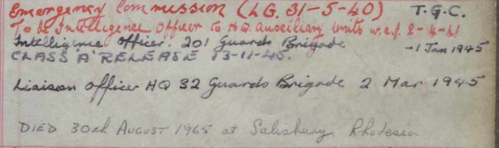 He died of respiratory issues on the 30 August 1965 in St Anne's Hospital, Avondale, Salisbury, Rhodesia (now Zimbabwe) age 55, where he was a farmer.