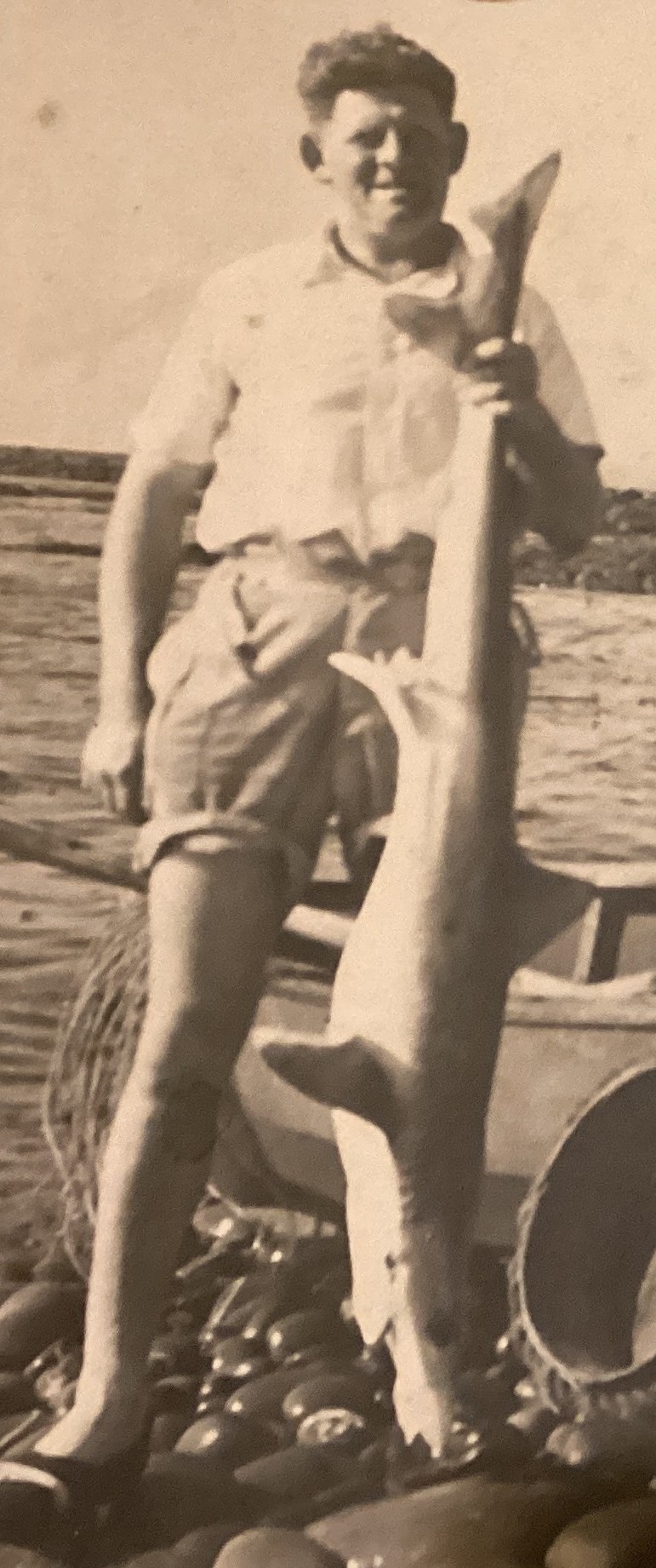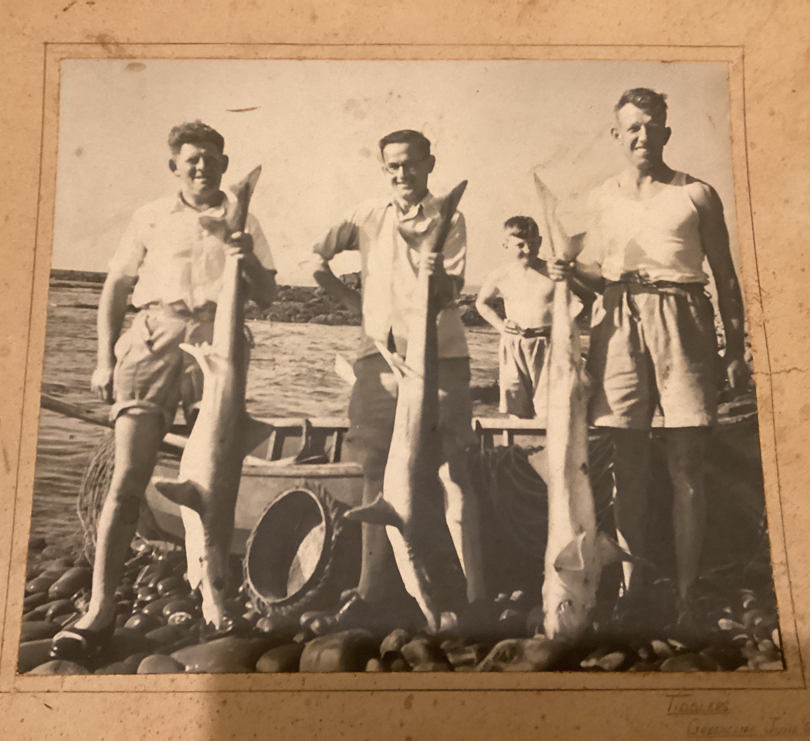 Arthur Elliott; "I do have a photo of William and Bill taken in 1951. Bill Copp is on the left, and William is on the right. (The man in the middle was William’s brother-in-law Arther Powe, who had been a prisoner of war with the Japanese and worked on the building of the railway in Thailand.) I am the boy in the background. The photo was taken at Greencliff Beach, and features the boat my father built".